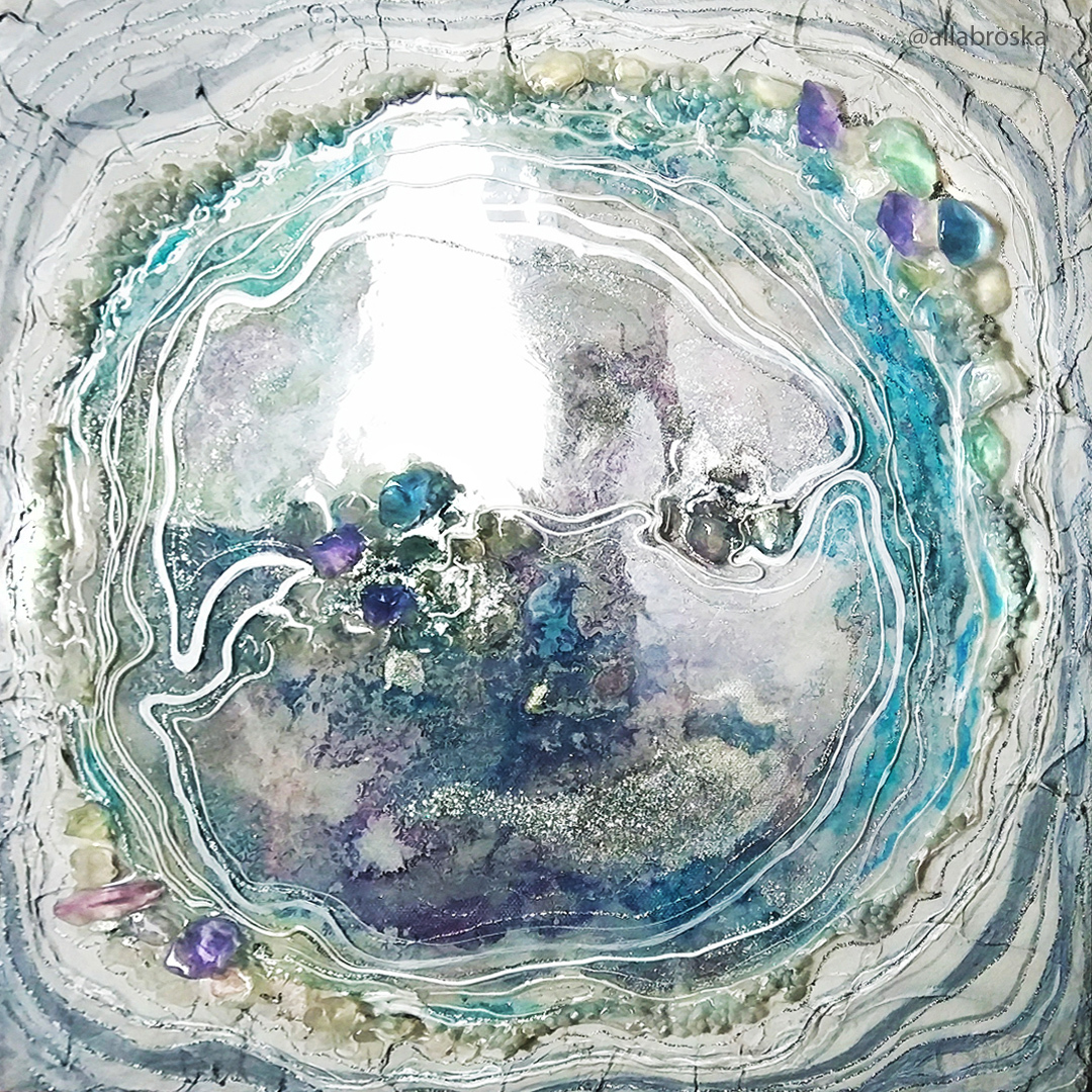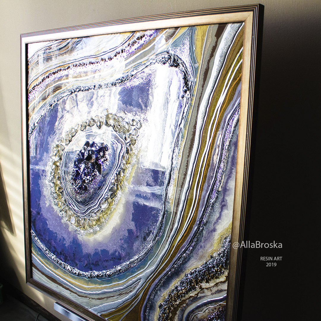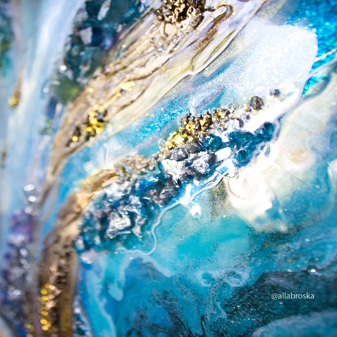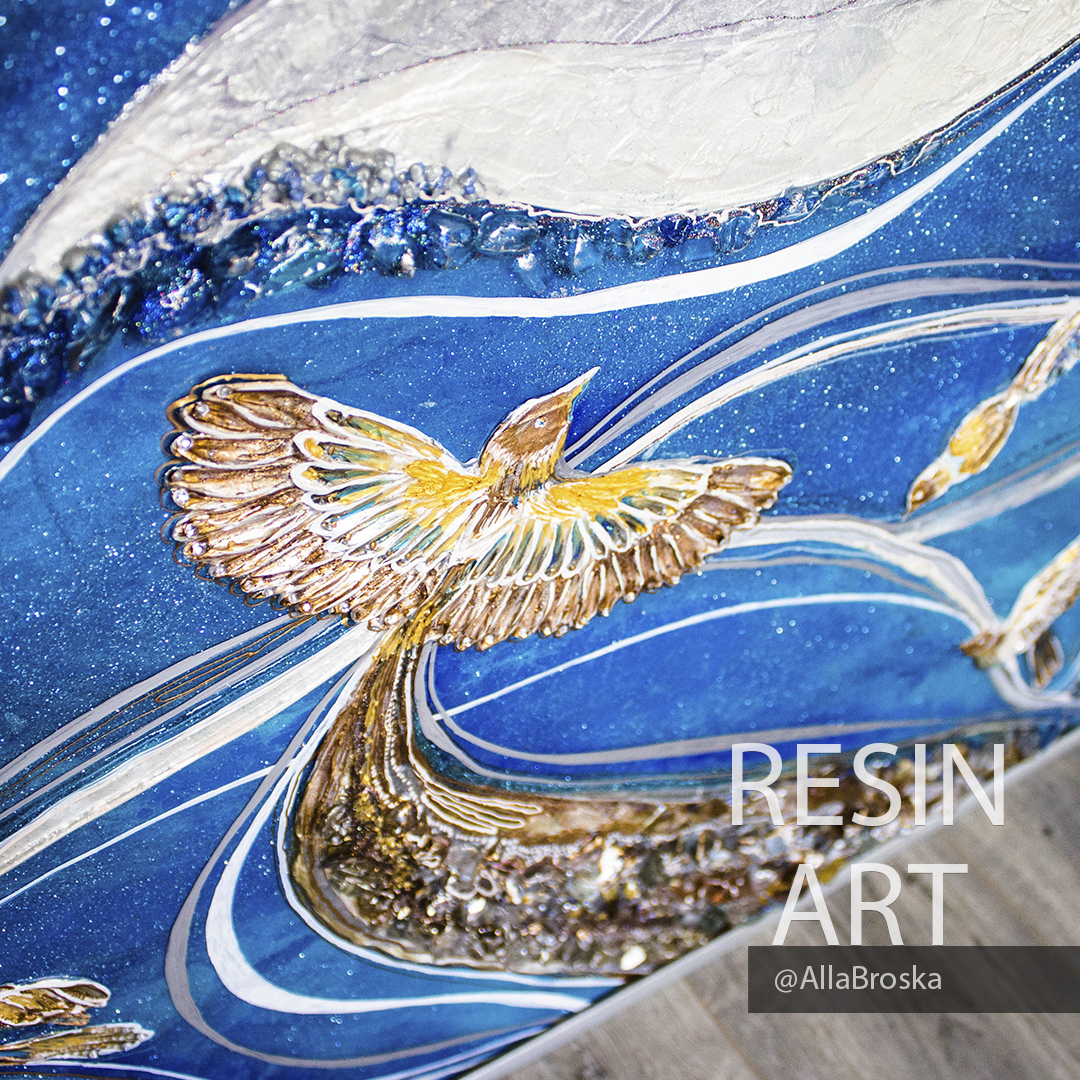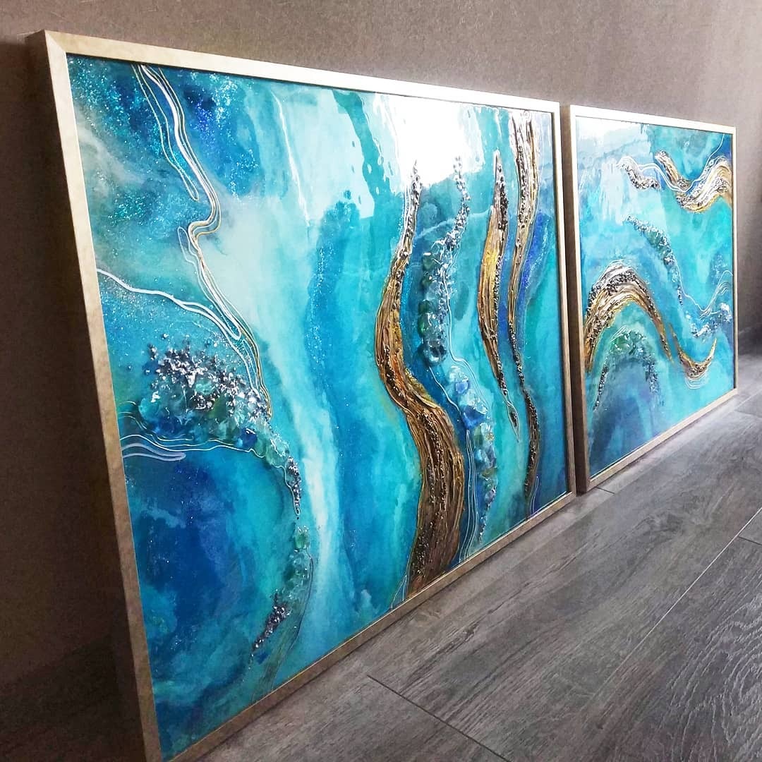 Поверхность картин из эпоксидной смолой глянцевая и глакая, но может быть микс из кристалов и камней, а так же декоративных фактур. Иногда комбинируют с жидким акрилом. А можно добавить не только абстрактные элементы, но и например цветок или птицу из текстурной пасты. К сожалению техника не позволяет делать реалистичные картины, а скорее декоративные, но завораживающие игрой света и фактур.