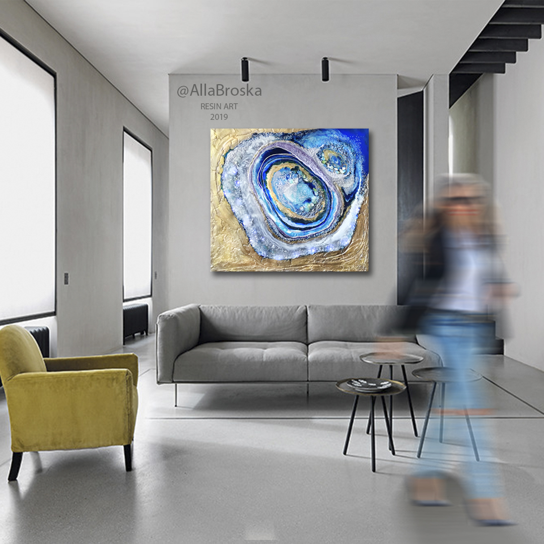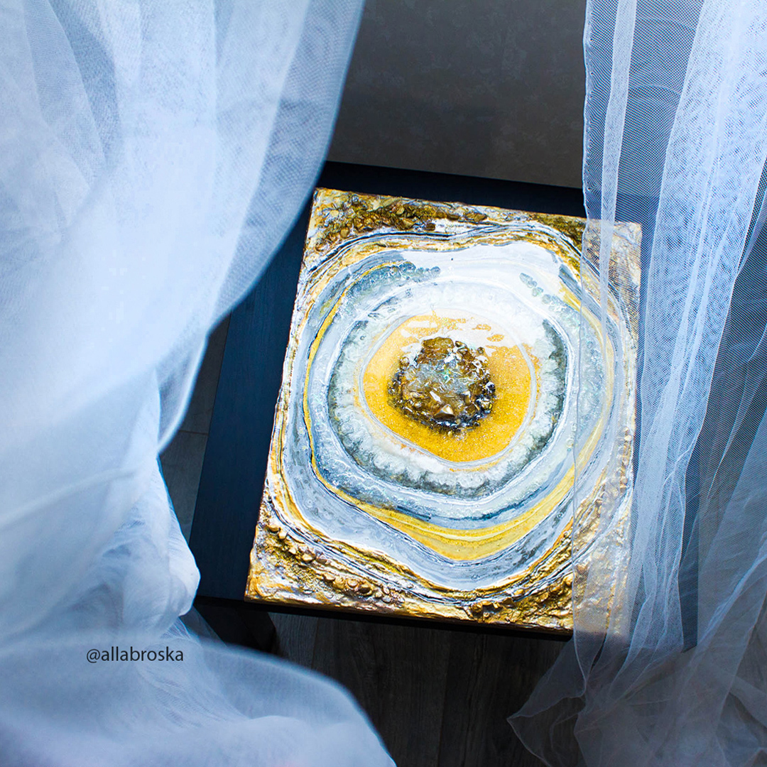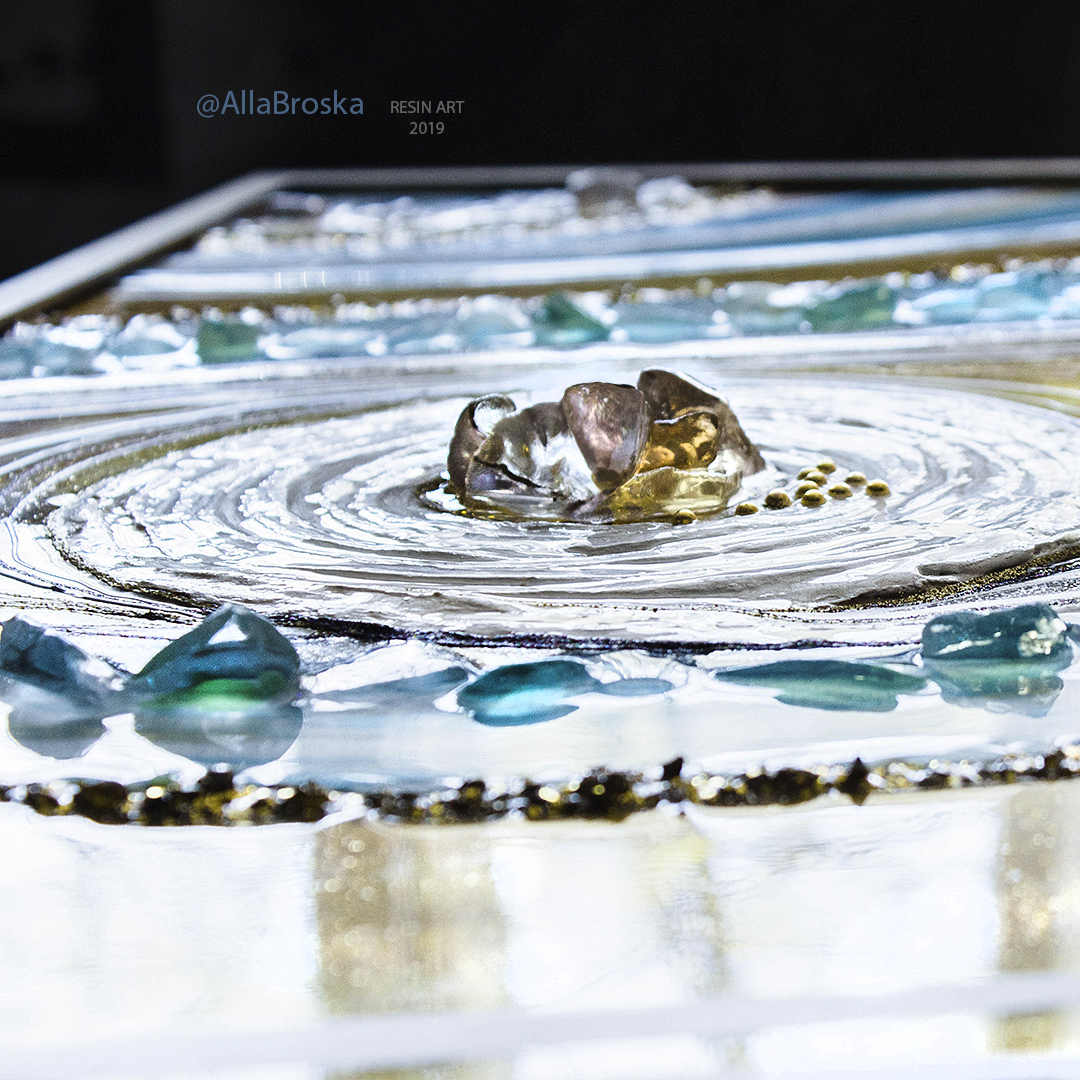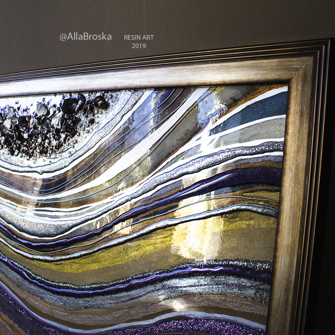 Поверхность картин из эпоксидной смолой глянцевая и глакая, но может быть микс из кристалов и камней, а так же декоративных фактур. Иногда комбинируют с жидким акрилом. А можно добавить не только абстрактные элементы, но и например цветок или птицу из текстурной пасты. К сожалению техника не позволяет делать реалистичные картины, а скорее декоративные, но завораживающие игрой света и фактур.