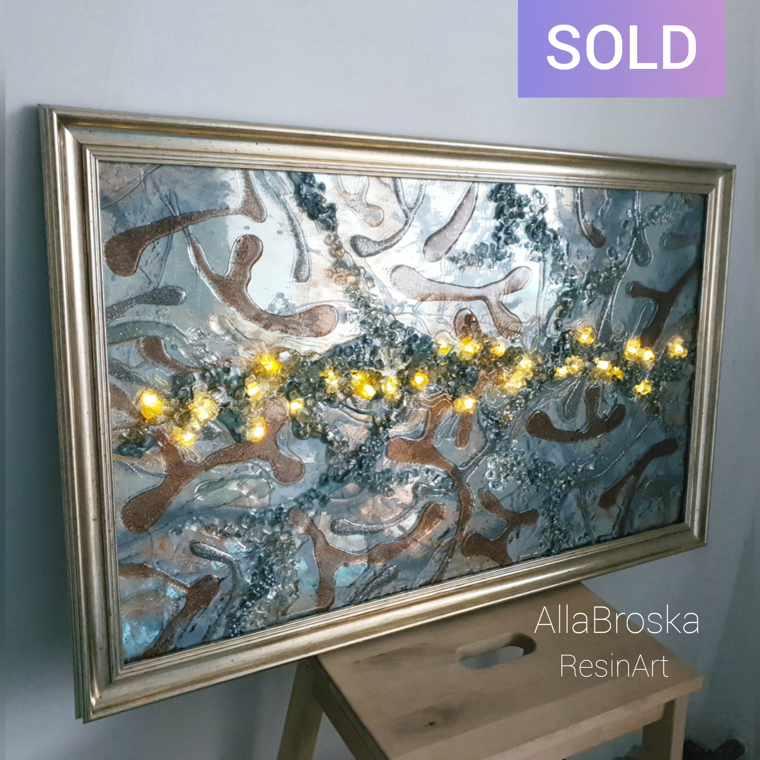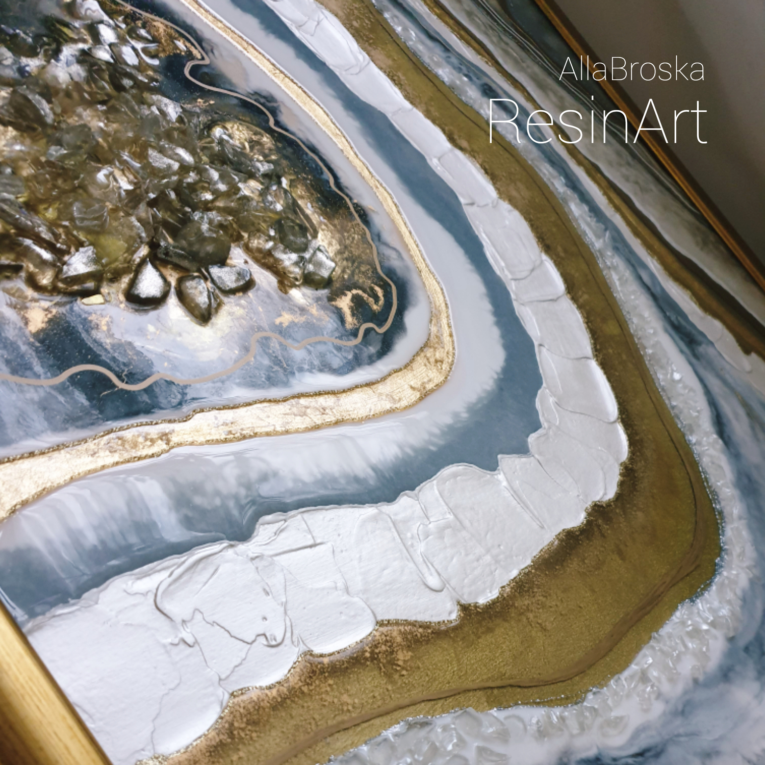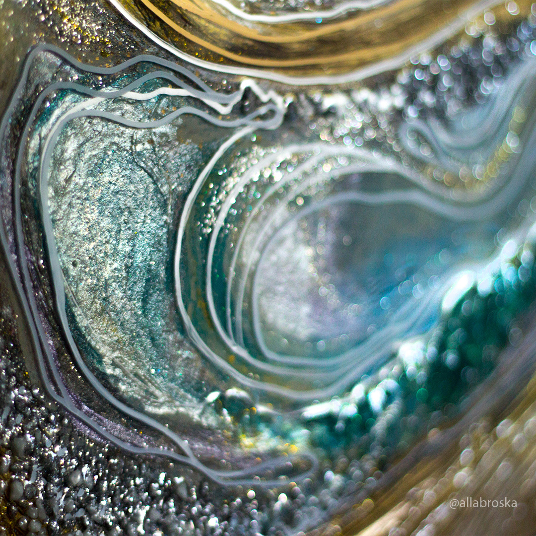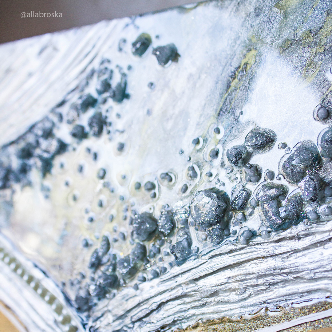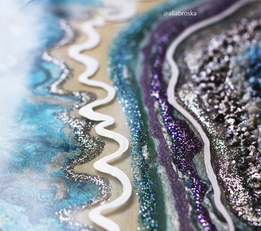 Поверхность картин из эпоксидной смолой глянцевая и глакая, но может быть микс из кристалов и камней, а так же декоративных фактур. Иногда комбинируют с жидким акрилом. А можно добавить не только абстрактные элементы, но и например цветок или птицу из текстурной пасты. К сожалению техника не позволяет делать реалистичные картины, а скорее декоративные, но завораживающие игрой света и фактур.